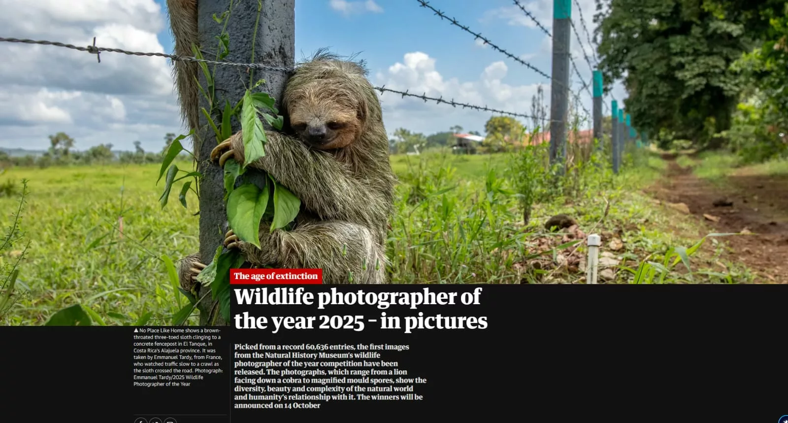Sa photographie marquante représente un paresseux à trois doigts prise au Costa Rica, dans la province d’Alajuela, à El Tanque.